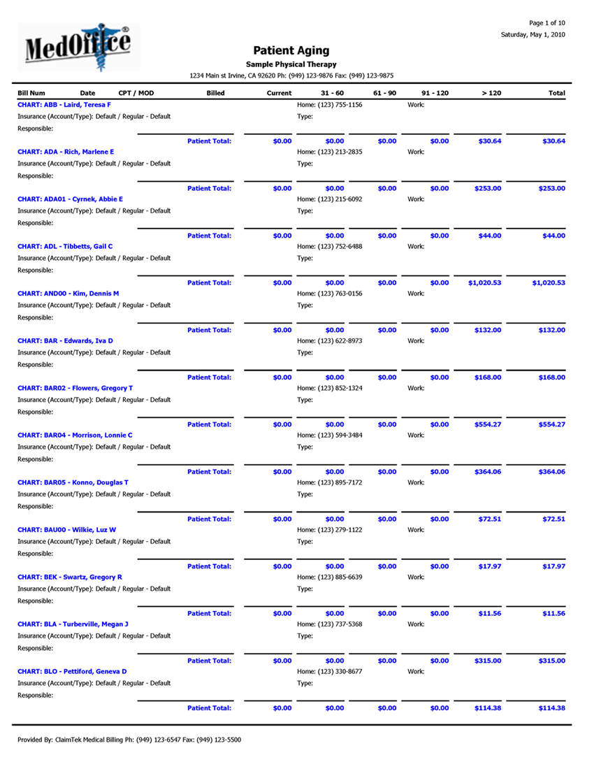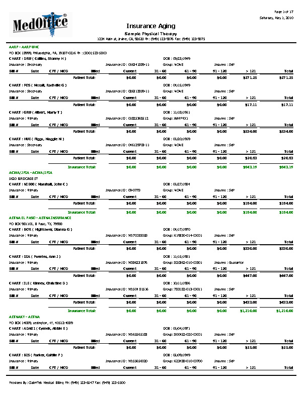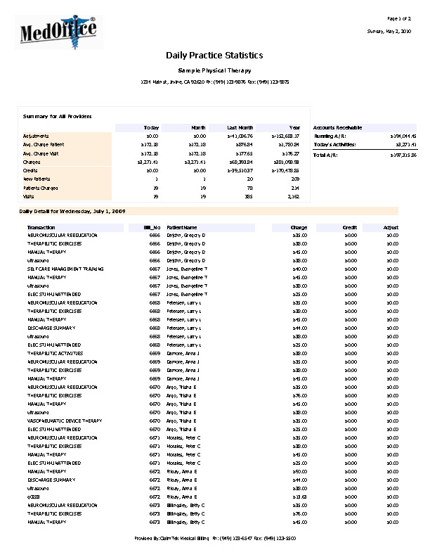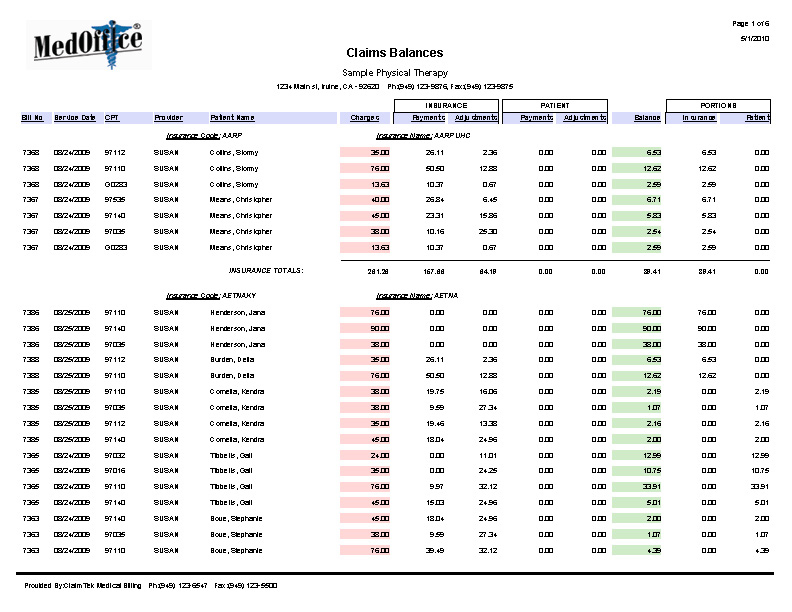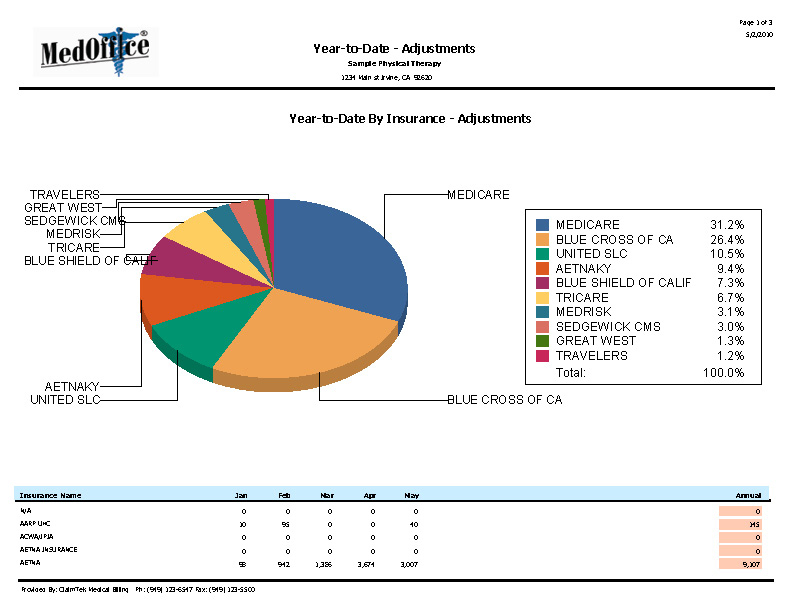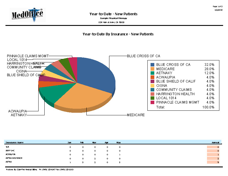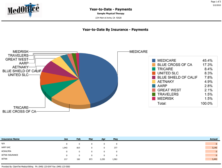 • Provide you with comprehensive reports: We can provide you with highly detailed reports with colorful analysis charts and graphics tracking the status of every claim and showing the level of productivity of your practice.